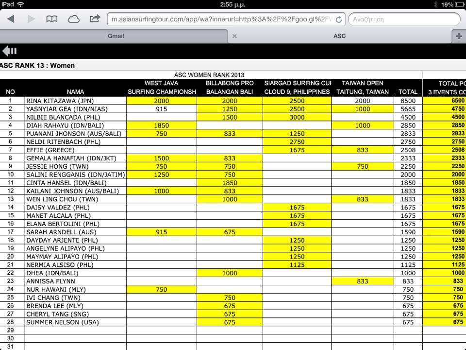 AFTER MY PARTICIPATION IN 2 ASIAN SURFING CHAPIONSHIP I’M FINALY ON THE 7TH POSISION FOR 2013